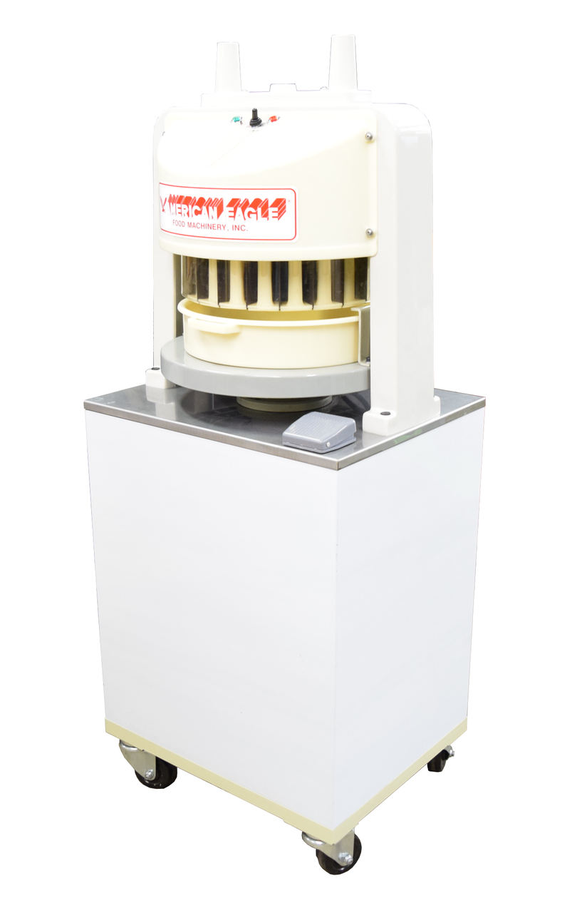 American Eagle® Dough Dividers are ideal for supermarket bakeries or retail bake shops! They offer excellent performance and value for your money! Use an electric divider and take the hard labor and guesswork out of using a manual divider. Our divider is easy to operate and handles a variety of dough types and weights. The machine features a powerful 1/4 HP motor that drives a heavy duty cam that pushes the dough tray upward, perfectly dividing dough into 36 equally weighted pieces. A sealed motor design with overload protection and permanently lubricated drive shaft ensures years of low maintenance service. A standard safety sensor prevents the machine from operating without the dough tray installed, and will automatically shut off the machine if the tray is removed, independent power and start buttons prevents the machine from accidentally starting without operator intervention.
